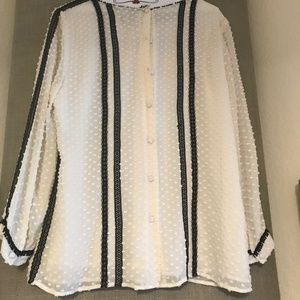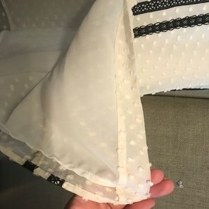 silk chiffon button back blouse, 3/4 sleeve 1 button cuff.,slight smocking in front,, 7 silk covered buttons in back. edges slight fraying, bodice of blouse fully lined, worn once and dry cleaned, absolutely no stains, pulls, rips or holes. non smoking home. seller is 5'10. 150 bs