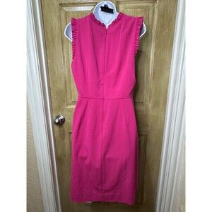 This J Crew size 10 dress in fuchsia pink is perfect for a variety of occasions, from workwear to casual or even parties. The dress features a sleeveless design with a ruffled neckline and a zip closure, making it stylish and easy to wear. Made from a blend of polyester and viscose, the dress is lined and has pockets for added functionality. Its knee-length pencil dress style and classic theme make it a versatile choice for the summer, fall, or spring seasons.