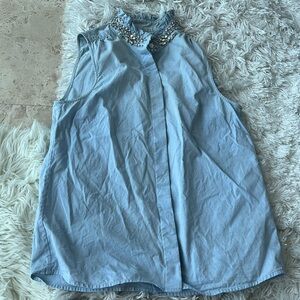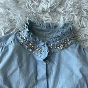 This is a J. Crew size 4 light blue jeweled button down top. It is in good used condition and the condition is reflective of the price. There is some yellowing due to use. The buttons are hidden.