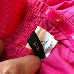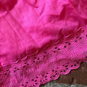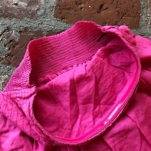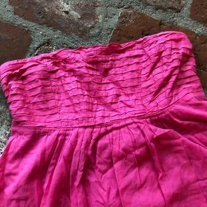 Size small hot pink strapless dress. 100% cotton in good used condition. Top part is stretchy and measures 13 inches from pit to pit. Some wear and discoloration around top. Measures 28 inches from top to bottom hem. Lined inside, very lightweight.