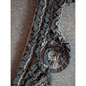 J. Crew, medium cardigan in gray, fine knit with black ribbon detail. This cardigan closes as a plunging v neckline. The ribbon trim seems organic and free form! This sweater measures 19 inches across from armpit to armpit and is 23 inches in length from shoulder seam to hem. Sleeve measures 21 inches in length.