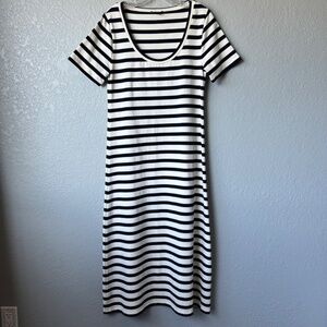 * Features: stripe stretch knit pullover midi dress, ankle length. T-shirt dress style, but fabric is thicker with nice weight and structure.