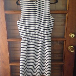 Super flattering navy and white striped J. Crew dress. Elastic at waist, zipper and clasp in the back.