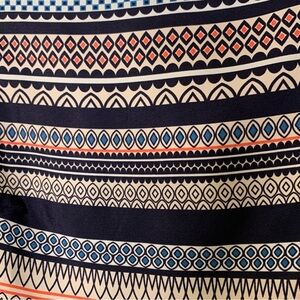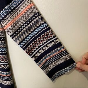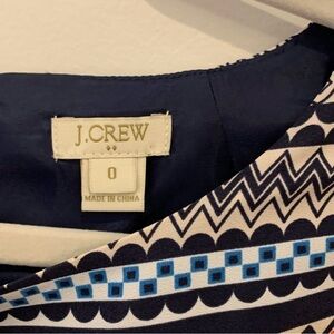 J. Crew striped multi pattern zigzag, diamond, dot, checkered in navy, blue and coral neon on a tan background sheath long sleeve dress with a button keyhole closure in back. Classic style with a little pizazz! Perfect for the office, date night, or baby/bridal showers, transitional piece. Size 0