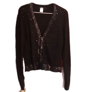 J.Crew black Merino wool zip front cardigan sweater, . the J crew Merino wool sweater has sequins and a zip up front. it is marked size and medium but fits more like a small.