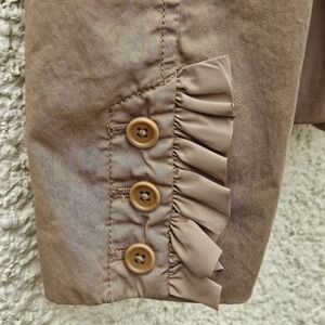 Cute and feminine khaki chino blazer-style jacket. Has ruffles as trim around the neck, down the front, at the wrists, and around the waist. Chest and waist pockets. Fastens in the front with hooks. In good used condition with no known flaws.