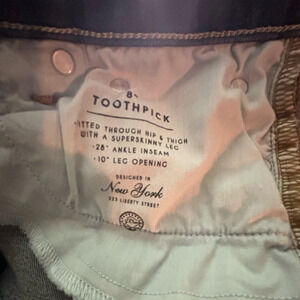 J. Crew toothpick jeans 28” ankle inseam; 10” leg opening; Fair Trade certified