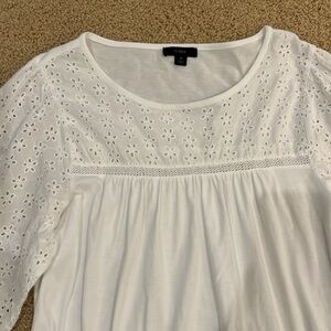 Cute top to wear with jeans or shorts. Eyelet Sleeves and neck. Bottom is a soft t shirt material. EUC.