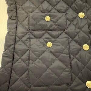 Quilted, black, J. Crew vest in size XS. All gold tone are snaps and inside is lined in navy. Measurements are approximately 18” pit to pit and mid shoulder to hem is 21.5”. Vest is light weight and in excellent, barely worn condition.