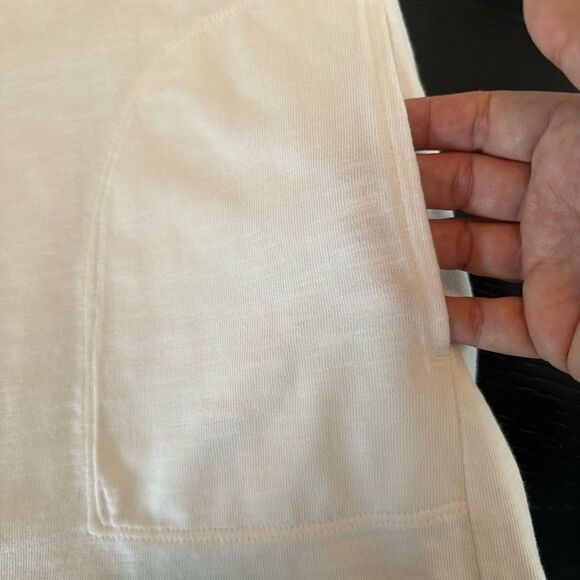 Casual white, pullover, short sleeve t-shirt dress by J. Crew with v-neck, big side pockets and trimmed in tweed print. V-neckline. 100% cotton. Length 34” x Width 19”.