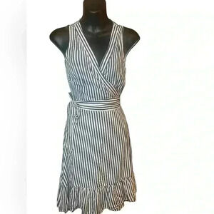 J. Crew women’s white/blue Striped beach wrap dress silky-soft fabric ruffled hem size XXS this dress can fit up to a small. Gently used no flaws.