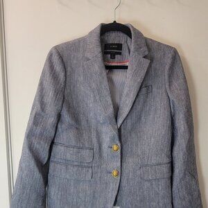 This J Crew women's blazer in size 2 features a blue and white Dalton line design, perfect for casual, workwear, or business occasions. Made from a linen blend and cotton material, this blazer from J.CREW is a classic and preppy piece. With its lined interior and stylish blazer design, this versatile piece is a great addition to any woman's wardrobe, reflecting a colorful and city-inspired theme.
