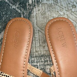 Chic J. Crew sandals with leopard print and tan straps. Ideal for summer wear.