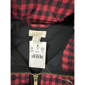 This is a J.CREW women's quilted puffer vest in red with a check pattern. It is sleeveless with a zip closure, featuring front pockets and a short length. The outer shell is made of polyester, and it is lined with polyester as well. This size S vest is designed for casual wear and is insulated with down, suitable for winter and fall seasons. It has a classic outdoor theme and brand new condition.
