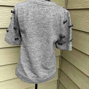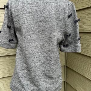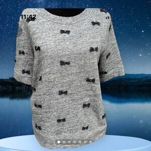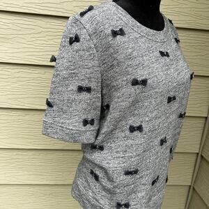 J. Crew women’s size S, crewneck sweatshirt. Short sleeves, gray with navy ribbon bows with a bead in the center of each bow.