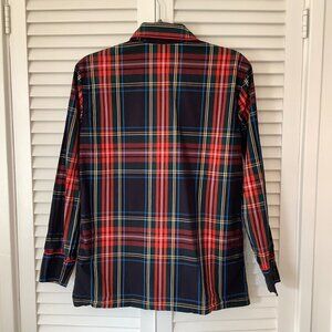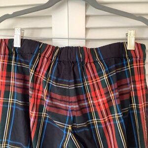 J. Crew women's pajama set, size XS. Pants and a long-sleeved blouse. Shirt has a rounded collar. Red, black and green tartan plaid. Gently worn, in excellent used condition. No rips or stains. 100% cotton.