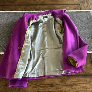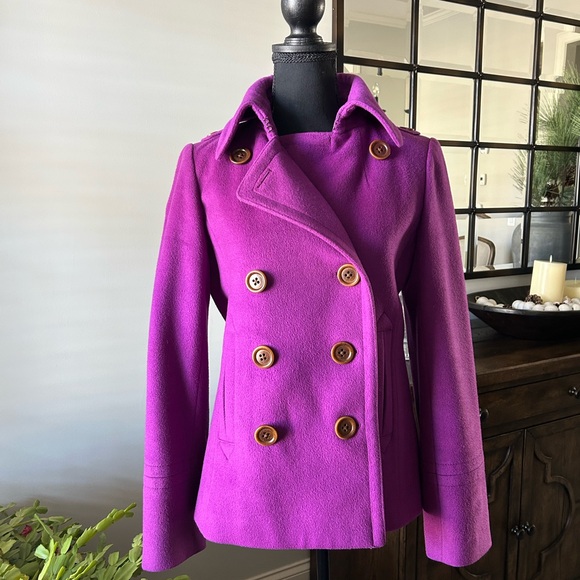 J. Crew women’s pea coat in a gorgeous purple color. Material is 100% wool in size small. It fits true to size. Excellent condition.
