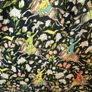 Black base with tan and ivory horses ridden by light blue, chartreuse and orange jockeys with pink and white flowers throughout