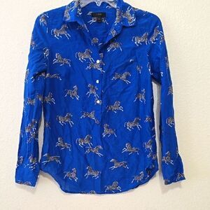 This J. Crew top features a striking blue color with a notched collar and long sleeves, perfect for a polished look. The button-down style adds a touch of sophistication, making it ideal for both casual and semi-formal occasions. Its smooth fabric and fitted design ensure comfort and style throughout the day.