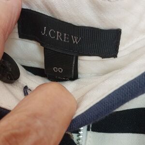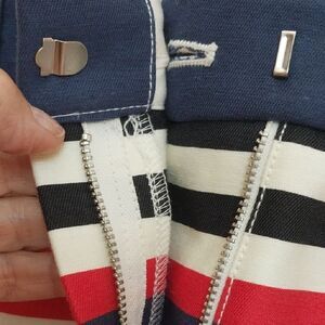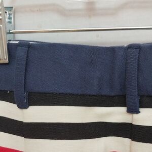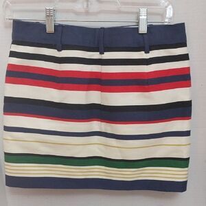 This chic mini skirt from J. Crew features a striking blue and red striped pattern, perfect for casual or resort wear. Its bold design and vibrant colors make it a standout piece for any wardrobe. Enjoy the playful yet sophisticated look it brings to your style. Note the gtwo frontg pockets and belt loops.