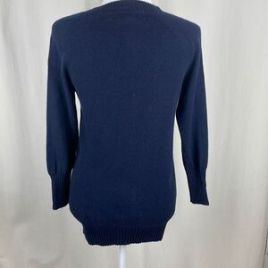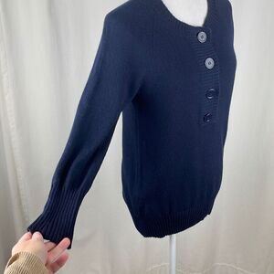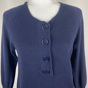 J. Crew Navy Blue Cashmere Henley 4 Button Pullover Sweater sz S. Features lightweight and soft navy blue 100% Cashmere knit, 4 painted metal fully functional buttons on the front, ribbed knit trim on neckline, hemline and cuffs, slight balloon sleeves (cuffs have wider bands), longline fit. Gently worn and clean with some light pilling but no flaws to note. Retail was $148!