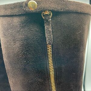 These gorgeous boots are in excellent pre-owned condition. They are soft brown suede and have leather bottoms. There is a big gold zipper down the outside to make them easier to get on and off. The top has a snap tan to hold the zipper pull in place. The boot shaft is approximately 13” from the heel. The calf circumference is about 15”.