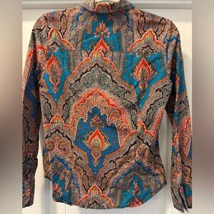 Vibrant paisley shirt with long sleeves. Features a mix of blue, red, and tan colors. Slim fit. Size: 6. VGC.