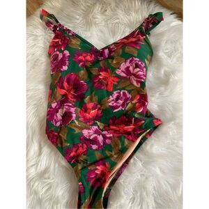 J Crew Emerald Green Bold Floral Ruffled Shoulder Swimsuit Size s
