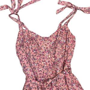 Peach, button-front midi dress with ruffle hem and tie straps. Comes with matching belt that can be wrapped around to accentuate the waist. Very pretty flowy boho look. Stretchy back.