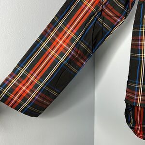 This is so pretty! I love the contrast of the plaid with the bedazzled buttons. Pit to pit 19” and length of front is 24”. Long sleeve. Funnel neck. Awesome!