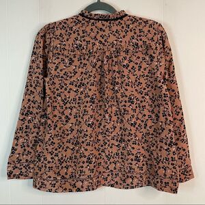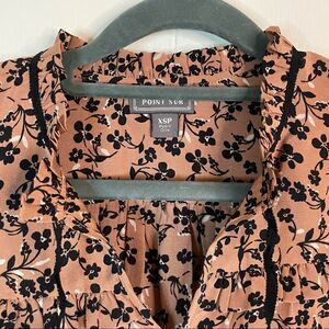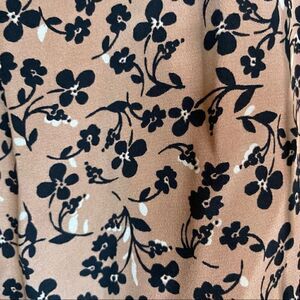 His cute silk top is in excellent pre-owned condition. It is tan and has a black floral pattern. There is a thin grosgrain ribbon to tie at the top by the neck. The bottom and sleeves have an open lattice design as well.