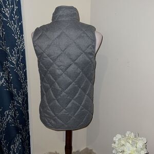 Good, preloved condition. J. Crew Quilted Down Excursion Vest in Flannel. Gray shade. Front pockets. Front zipper. Minimum wear. Slight wear to snaps.