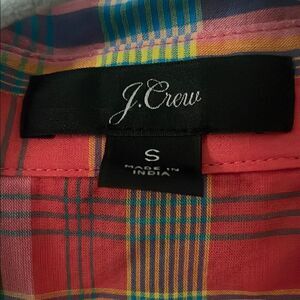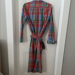 Like new preowned J. Crew maxi dress showcases a vibrant red and green color palette, perfect for casual wear as a dress or cover up. Featuring a notched collar and cuffed long sleeves and detached belt/tie, it offers a classic shirt style with a buttoned front. The dress is designed for comfort and style, making it a versatile addition to any wardrobe.