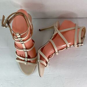 Strapy Sandler, blush pink genuine leather, made in Italy, adjustable strap buckle closure, stiletto heel, 3” heel. Color is very blush pink.