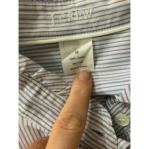 J Crew Womens Whote Pink Blue Striped Long Sleeve Dress Shirt Top 12 Large. Condition is Pre-owned. Shipped with USPS First Class Package. Length 26.5, bust 41, waist 38, hips 42. Measurements in inches. Smoke and pet free home. Fast shipping. Mark as shown in photo.