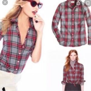 J. Crew The Perfect Shirt gray/red plaid 100% cotton button down shirt. Extra buttons included. Left sheet pocket. Shoulder seam topstitching. Size XS. Excellent condition. Nonsmoking home.