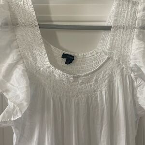Like new condition- never worn! This flowy, 100% cotton dress from J. Crew features a delicate smocked neckline and charming flutter sleeves, offering a romantic and vintage-inspired look. Crafted in a light and airy fabric, the dress is adorned with ruffled details that add a feminine touch. Perfect for any occasion,it is a versatile addition to your wardrobe.