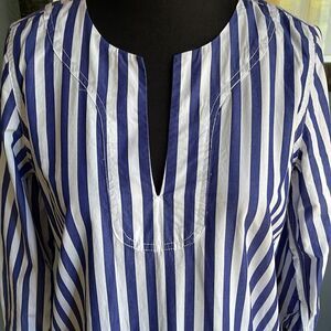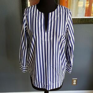J. Crew blue/white stripe cotton poplin button cuff notched curved topstitch panel neckline top. Curved topstitched hem. Back yoke with center pleat. 100% cotton. Excellent condition. Nonsmoking home. XXS.