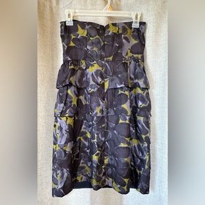 This J. Crew strapless silk mini dress is in excellent pre-owned condition. Women’s size 6. 100% Silk skirt base. Cloth and lining are a polyester/cotton blend. Color is black and gray floral/botanical print on top of chartreuse backdrop. Peplum/ruffle waist and ruching at bust. Bodice has light, flexible boning along seams, as well as stretchy straps with hook and eye closure for extra support and security.