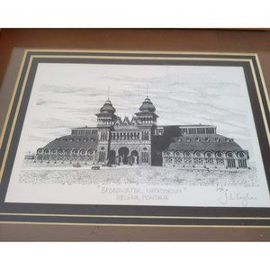 J. E. Coyle was a professional artist in Sandy, UT starting in the 1970s. He was basically self taught, gradually developing his own style over the years. He focused on pen and ink drawings of buildings, locomotives and ghost towns. The Broadwater Hotel and Natatorium would have been long left empty at the time he drew them, being torn down soon afterwards. The Broadwater was built in the heyday of Helena's gold rush fortune in the late 1800's as a lavish resort by Colonel Charles Broadwater. It stood as a symbol of Helena’s wealth and Montana’s progressiveness. Built with an investment of $500,000, these structures were designed in the Moorish Spanish architectural style. When the Broadwater Natatorium premiered in August 1889, it was the largest natural hot water plunge in the world. However, Colonel Broadwater died just a few years after the opening, and the hotel closed its doors before the end of the century.