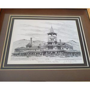 Set of 2 Pen and Ink Art Prints, with original signature by the artist James E. Coyle. Matted and framed with glass in solid wood frames, in excellent condition. These are scenes of 1970's Helena, Montana - the Broadwater Hotel, and the Broadwater Natatorium (which were torn down in 1974 after sustaining earthquake damage). Fantastic examples of Montana history! Each print measures about 9x12 inches.