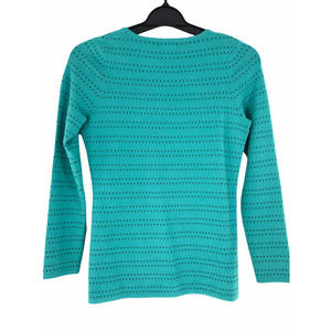 TEAL TEXTURED STRIPE KNIT. SIZE S. THIS IS A BEAUTIFUL TEAL-COLORED LONG SLEEVE BLOUSE. SQUARE DESIGNS ALL ACROSS THE BLOUSE FROM THE FRONT TO THE BACK, THE SHIRT ALSO HAS OPEN SIDE CUTS ON THE SIDES FOR A MORE CASUAL LOOK.