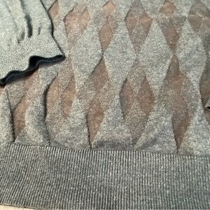 Very subtle argyle pattern in grey and a muted brown. V-neck with ribbed cuffs and hem.