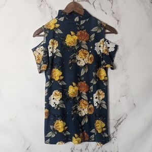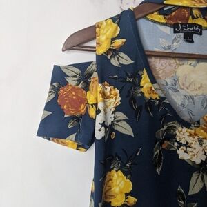 J For Justify Shirt Womens Small Cut Out Mock V Neck Stretch Soft Blue Floral