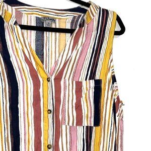 This sleeveless dress features vibrant multicolor stripes and a casual button-front design. Made with 100% cotton, it offers breathable comfort and effortless style.