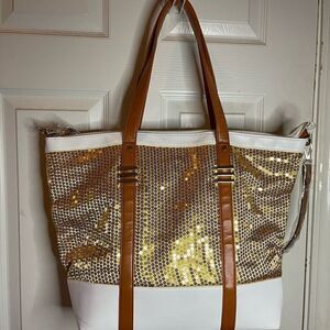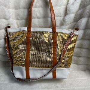 J Francis gold sequins with white and tan faux leather trims tote/shoulder bag.