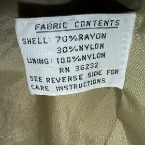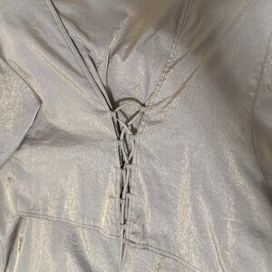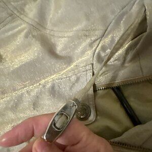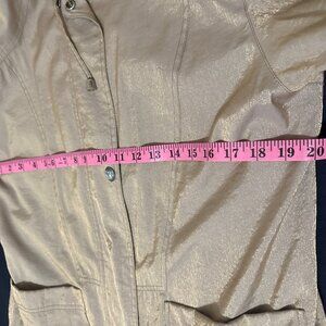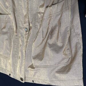 J. GALLERY WOMEN'S METALLICA LIGHT GOLD CAR JACKET WITH HOOD, SIZE MEDIUM. The jacket has a criss-cross tie in the back. Zipper and snap closure. Snaps do a little patina on a few of them. Lightly used, no holes, tears, or stains, only a bit of patina on a couple of snaps. Lightweight but does have lining. Large Front Pockets.