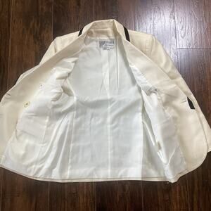Creamy white wool blazer with contrasting black trim by J.Gallery in good preowned condition. No flaws.