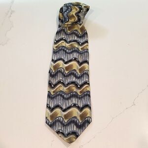 Vintage J. Garcia Silk Men's Necktie from the Wired Crossroads Collection Fourteen. Shades of blue, black and yellow in a wavy abstract print. 100% silk.