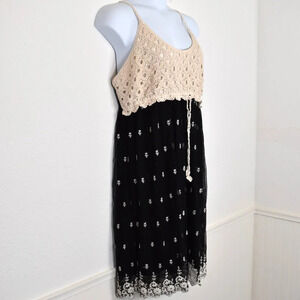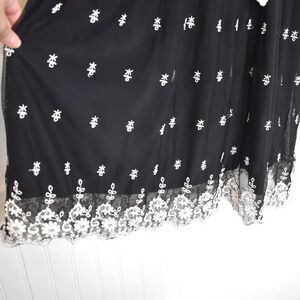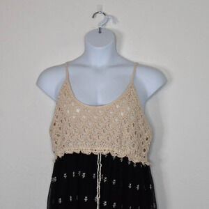 Pre-owned, good condition. No visible holes or stains. Normal signs of wear. Neutral shades of cream and black. Babydoll style. Crochet lace on chest area. Sheer tulle embroidered skirt with scalloped hemline. Adjustable spaghetti straps. Adjustable crochet tie under chest. Smocked back. Size per tag: 1X (1XL / Extra Large). Fabric: Self: 100% Polyester. Contrast: 100% Cotton. Lining: 100% Polyester. Size per tag does not guarantee desired fit, please see pictures for measurements.